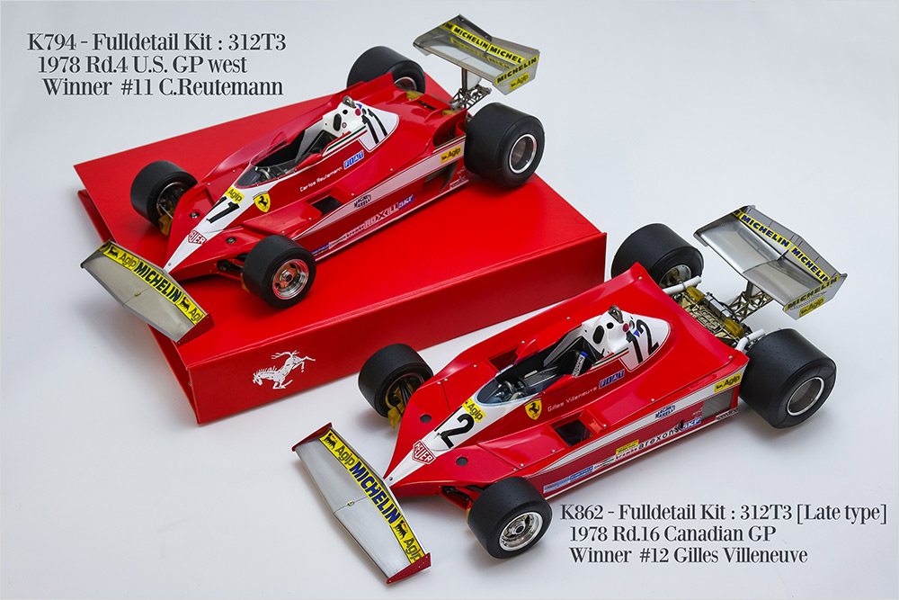 チャンピオンマシン「312T2」から、モノコック、ボディなど大幅な改良を加え、G.ヴィルヌーヴが最終戦の母国カナダGPで自身初優勝を挙げた「フェラーリ・312T3」の1/12スケールフルディテールキット。