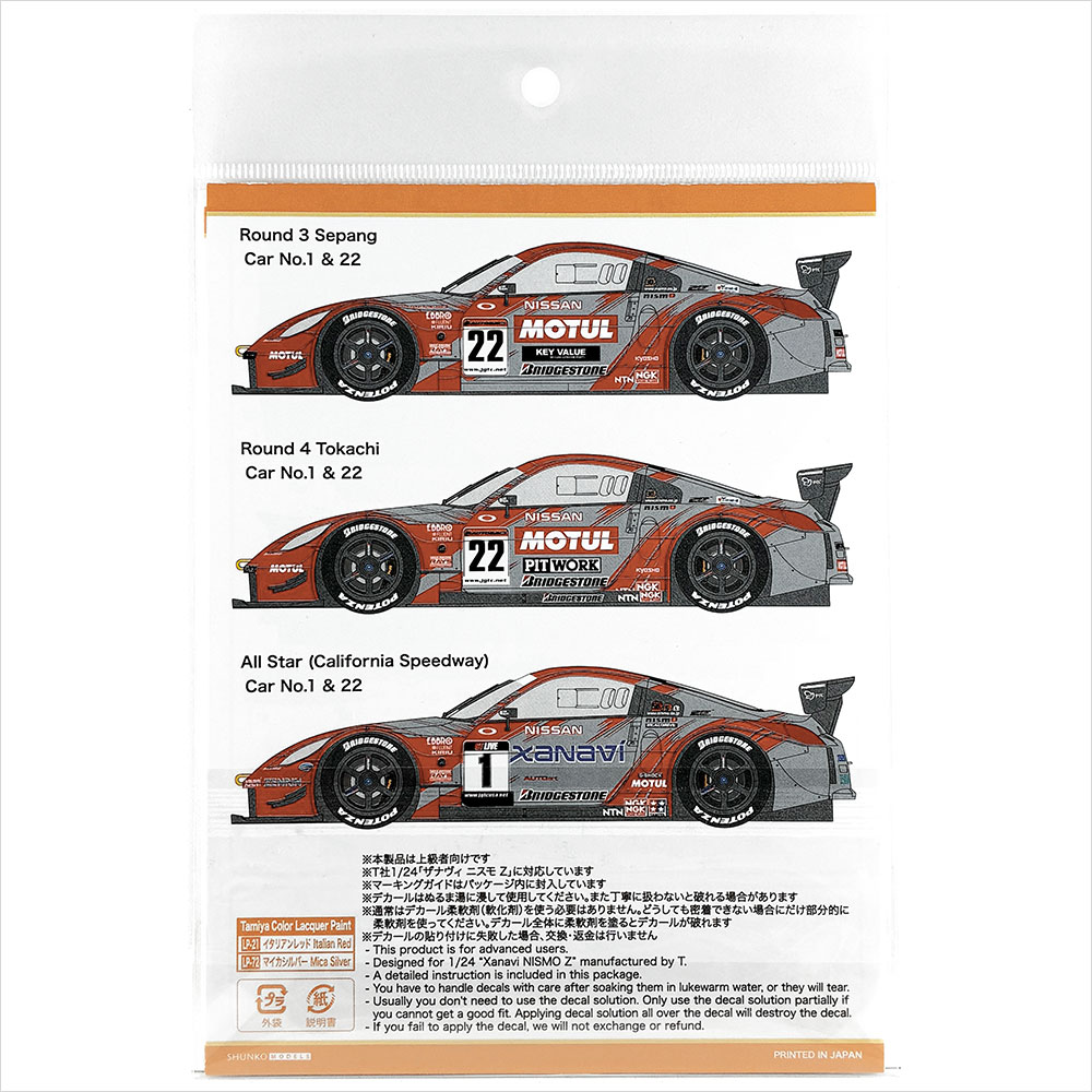 ベースキットと同じ2004年第4戦・十勝に加えて、スポンサーやゼッケンが異なる第3戦・セパンとオールスター戦のデカールも付属します。いずれも1号車と22号車の両方に対応しているので、全6パターンの中から1台を選んで制作ができます。