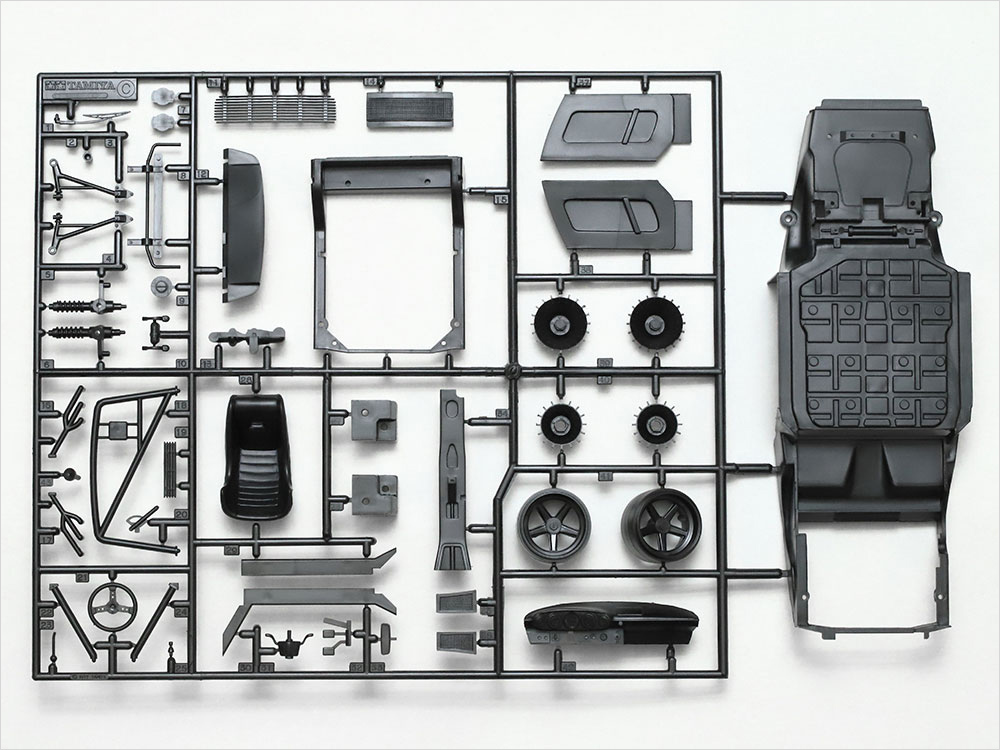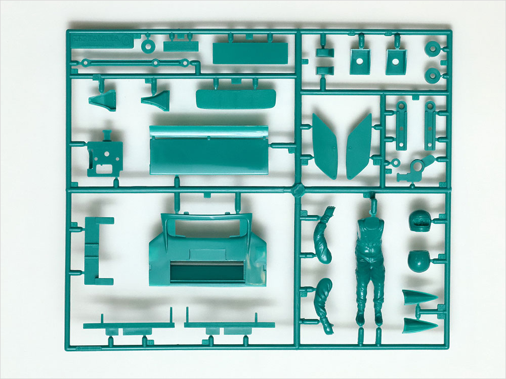 ■ エンジンフードは脱着可能。完成後も水平対向6気筒ターボエンジンを観察できます。ロールケージを備えたタイトなコクピットも立体感豊かな仕上がり。